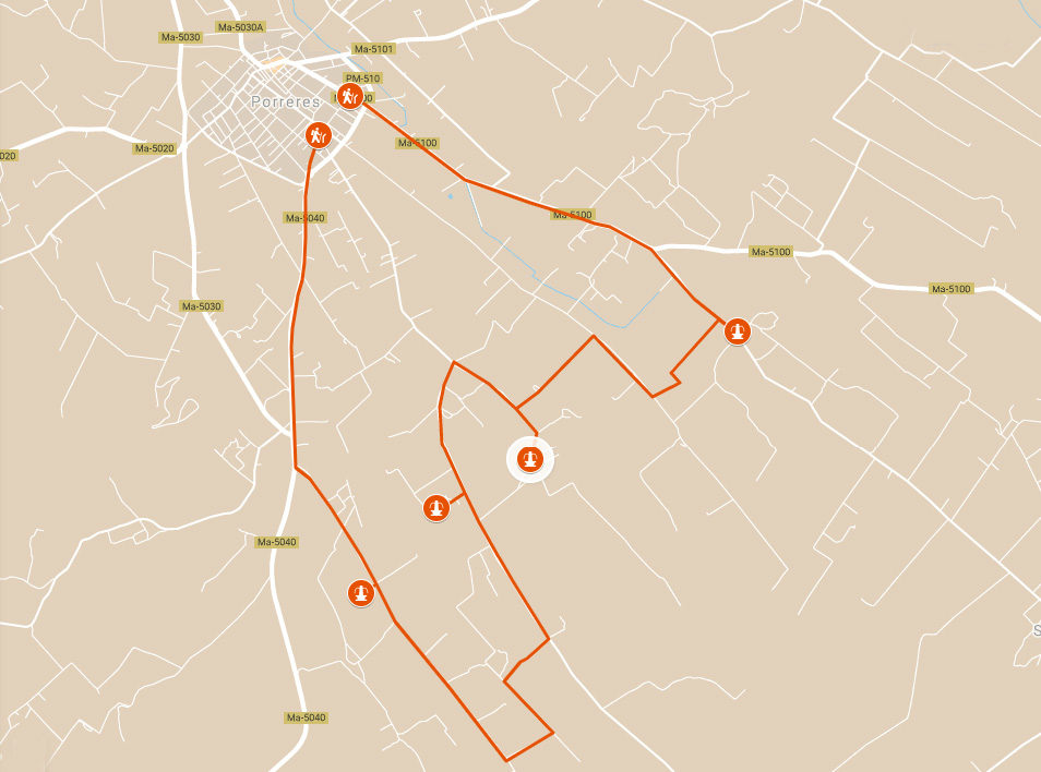 Der Startpunkt befindet sich am Molí de n'Amengual, neben einem Wasserrad, das ebenfalls Teil des Kulturerbes ist. Die Route beginnt am Molí de n'Amengual und führt in Richtung der Straße von Porreres nach Campos (Ma-5040).