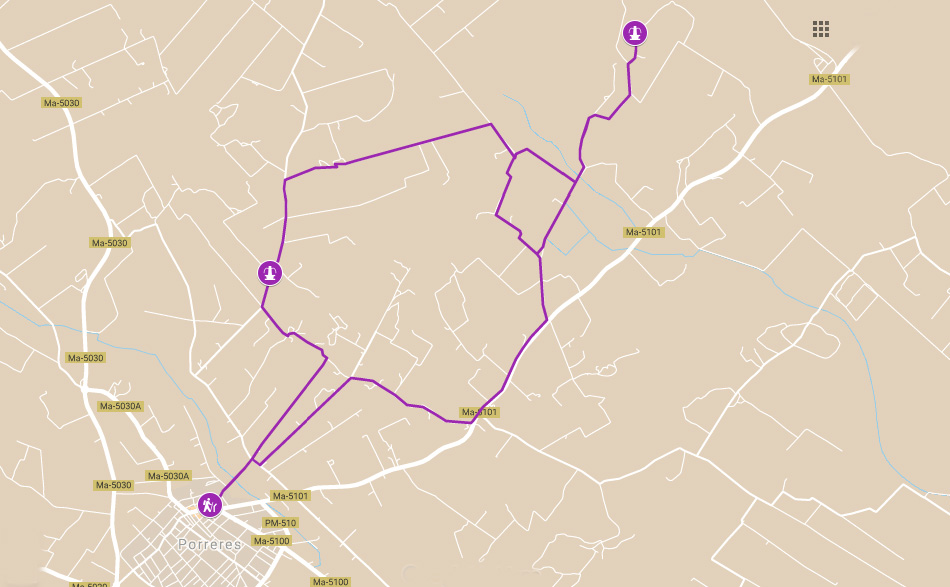 Die Route beginnt in der Ortsmitte (Plaça de l'Església). Nehmen Sie die Straße auf der linken Seite (Carrer del Pont), die zum Camino Real von Sineu und zum Weg nach Son Dagueta führt, bis Sie links in den Camino Real von Manacor einbiegen, der direkt zum Pou de Sa Carrera führt, einem sehr gut sichtbaren Brunnen neben der Straße. Hundert Meter weiter verlassen Sie diesen Weg und gehen rechts auf dem Weg nach Son Oms weiter, einem unbefestigten Weg mit einer Halbgebirgslandschaft, der das Landgut Son Oms bis zu einer Gabelung säumt. Wenn Sie der Route auf der linken Seite folgen, wie auf der Karte eingezeichnet, müssen Sie nach etwa 300 Metern wieder in Richtung abbiegen.